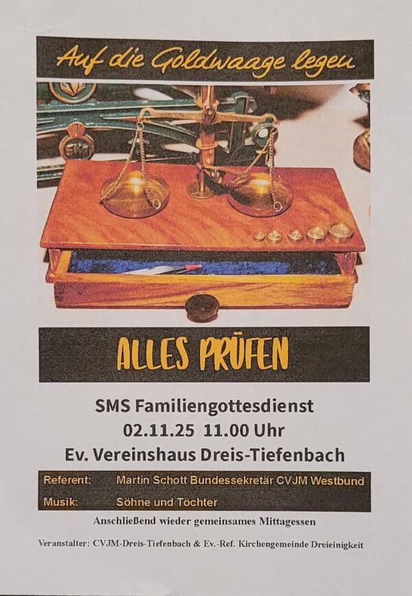 Herzliche Einladung zur SMS - die besondere SonntagMorgenStunde, die gemeinsam vom CVJM und der Ev.-Ref. Kirchengemeinde Dreieinigkeit gestaltet wird. Am 2. November 2025 ist es um 11.00 Uhr wieder soweit. Diesmal freuen wir uns Martin Schott vom CVJM Westbund , der seine Gedanken zum Thema "Auf die Goldwaage legen - alles prüfen" mit uns teilen wird. Außerdem wird die Band "Söhne und Töchter" zu Gast sein.Nach der SMS gibt es für alle ein gemeinsames Mittagessen.