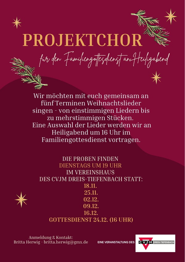 Am Heiligabend wird es um 16.00 Uhr im Vereinshaus einen Familiengottesdienst geben. Für die musikalische Gestaltung wird ein Projektchor Weihnachtslieder einüben - Ihr seid herzlich eingeladen, mitzuproben und mitzusingen. Die erste Probe findet am Dienstag, 18.11.2025 um 19.00 Uhr im Vereinshaus statt.