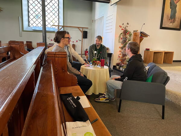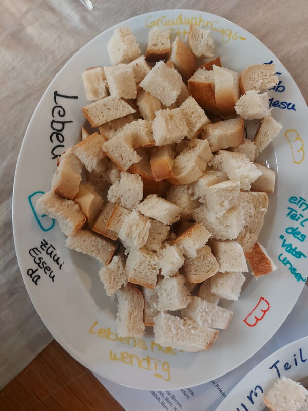Um sich besser kennenzulernen trugen alle Gottesdienstbesucher ein Namensschild. Verweilen und Quatschen war ausdrücklich erwünscht. Wir waren glücklich über den Besuch vieler Konfis und KU3-Kindern in unserm Gottesdienst, die sich motiviert im Gottesdienst eingebracht haben.