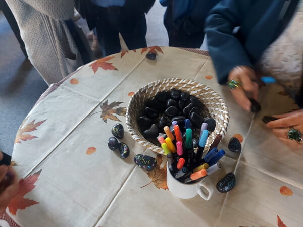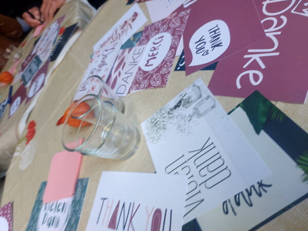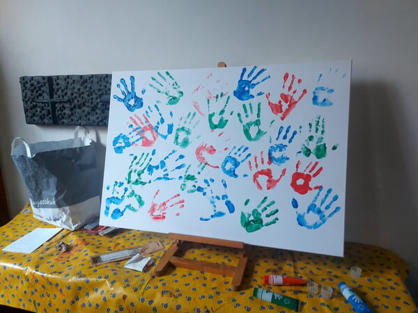 An verschiedenen Mitmachstationen konnten alle aktiv werden und ihren Beitrag leisten. So entstanden Mutsteine, die an alltägliche Helden erinnern, und eine große Collage aus „helfenden Händen, auf der viele Teilnehmende ihren bunten Handabdruck hinterließen. Gemeinsam mit Sebastian Schaufert bauten junge Gottesdienstbesucher die Geschichte vom barmherzigen Samariter aus LEGO, andere übten ein neues Lied ein, das später im Gottesdienst gemeinsam gesungen wurde. Auch die Dankgebete und Fürbitten für den Gottesdienst wurden in der
