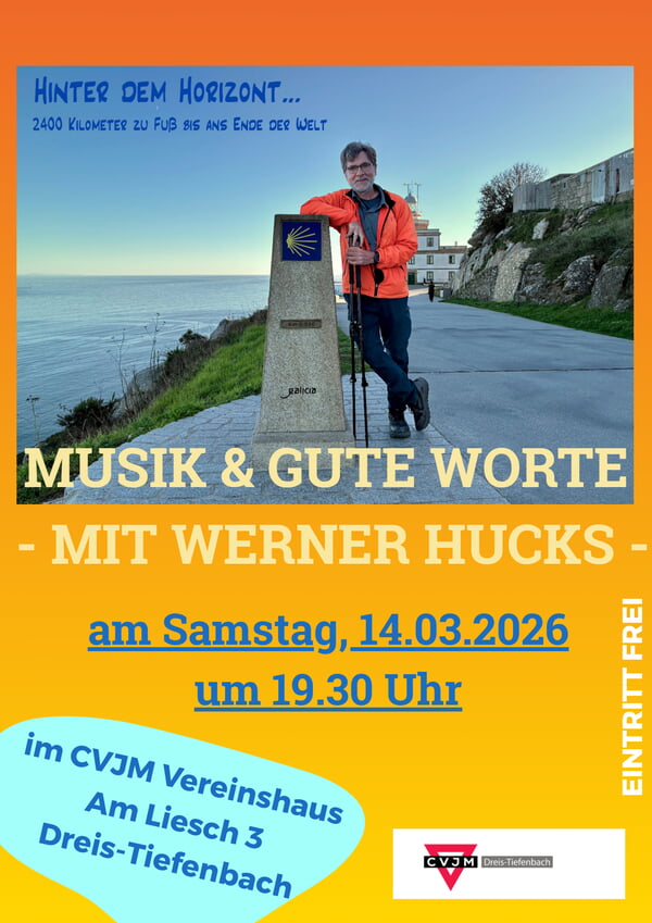 Dann wird Werner Hucks zu uns kommen. Der in Siegen-Niederschelden lebende Gitarrist ist seit Jahren ein begeisterter Pilger. Mit dem Eintritt in die Rente für seine Tätigkeit als Musikpädagoge (Konzerte gibt er natürlich nach wie vor) stellte sich ihm die Frage, wie es weitergeht. Was ist da hinter dem Horizont, was gibt es Neues, was von dem Alten kann gerne zurückbleiben oder will vielleicht noch verarbeitet werden? In 78 Tagen und auf 2.400 Kilometern begegnete Werner Hucks Menschen aus unterschiedlichsten Ländern und sozialen Bereichen. Dabei hat er die heilsame Wirkung des Pilgerns am eigenen Körper erfahren.Mit seinem Programm möchte Werner Hucks zeigen, dass es immer etwas hinter dem Horizont gibt, wofür es sich zu leben lohnt und dass es für ihn keine Alternative zu einem Leben in Dankbarkeit Gott gegenüber gibt.