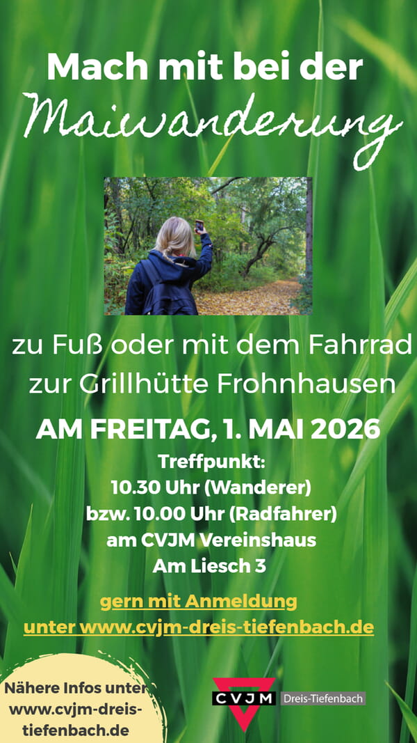 CVJM bewegt - am 1. Mai wollen wir uns gemeinsam auf den Weg machen und laden herzlich ein zu einer Maiwanderung zur Grillhütte in Frohnhausen.